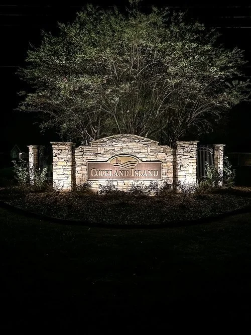 Night view of a stone entrance sign reading 'Cottage Island' with trees behind and illuminated landscaping.