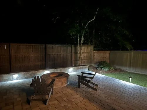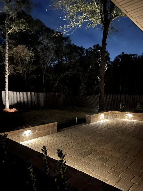 Nighttime backyard patio with brick pavers, soft ground lighting, tall trees, and a wooden fence in the background.