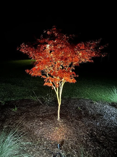 A young Japanese maple tree with vibrant red leaves illuminated at night, planted in a landscaped garden bed.