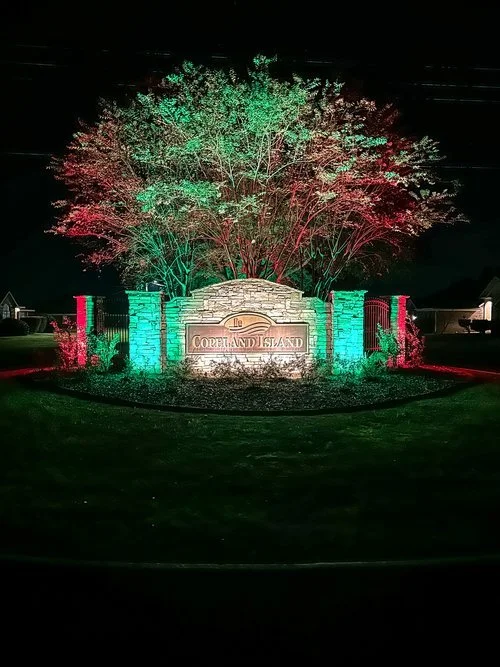 Night view of an illuminated entrance sign for Cotheland Island with a stone wall and gates, lit with red and blue lights, and a large tree with purple and blue lights in the background.