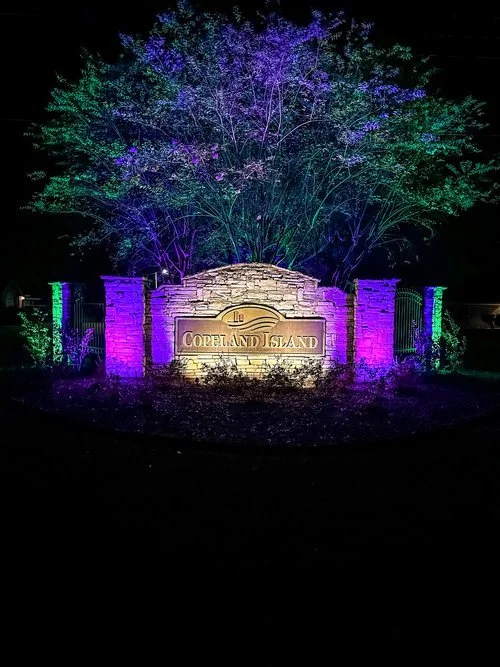 Nighttime illuminated entrance sign for Coreland Island, featuring a stone sign with red and green lighting and a large tree behind it.