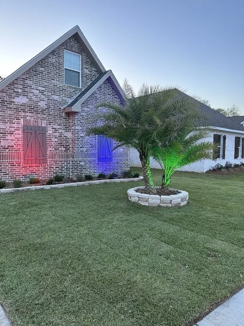 A brick house with a gabled roof, decorated with colorful LED lights, featuring a small landscaped yard with a palm tree surrounded by a circular stone border.
